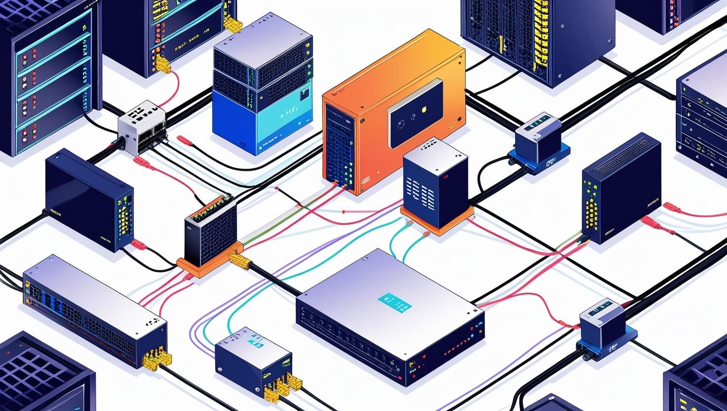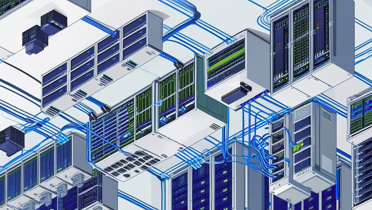 • کابل‌های شبکه (کابل‌های فیبر نوری یا مسی) که دستگاه‌ها و تجهیزات مختلف را به هم متصل می‌کنند.